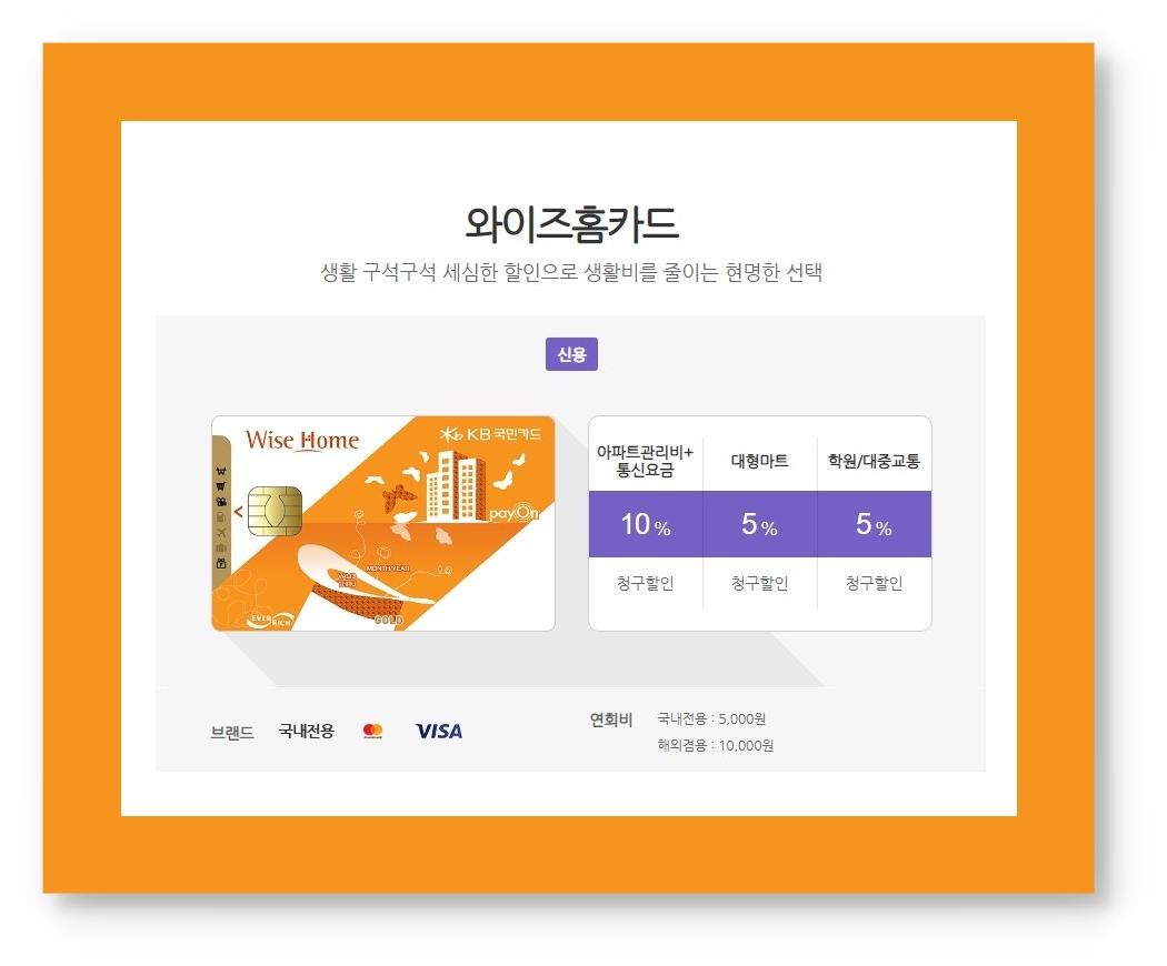 연회비도 5,000(국내전용)으로 타 카드에 비해 저렴한 편이라서 관리비 할인 혜택에 올인(?)하겠다 하시는 분들은 와이즈홈 카드 추천드려 봅니다.