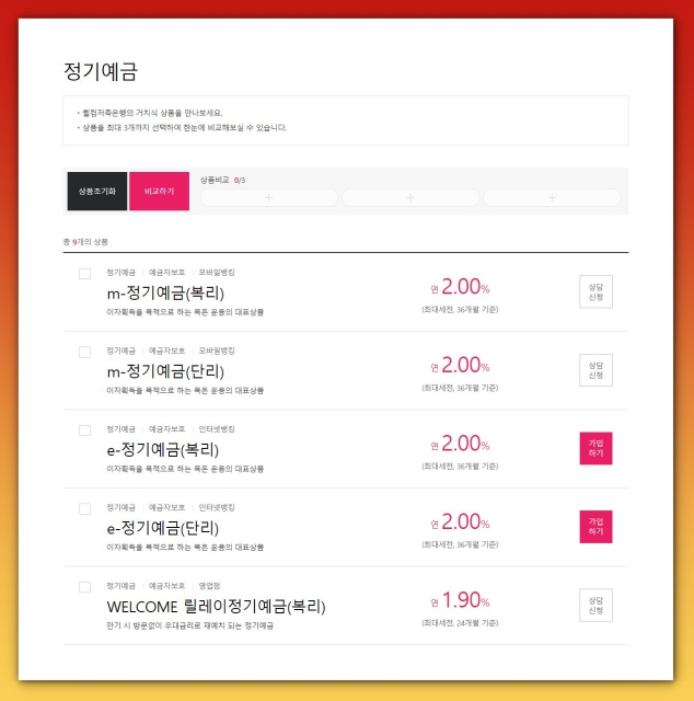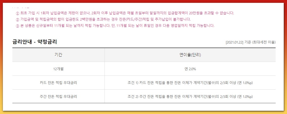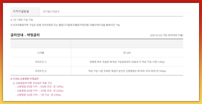 정기예금 금리는 2%대입니다. 제가 지난 포스팅에 말씀드렸던 복리 상품도 있어요. 모바일, 인터넷 뱅킹을 이용하면 이자를 더 높게 주는 듯합니다.