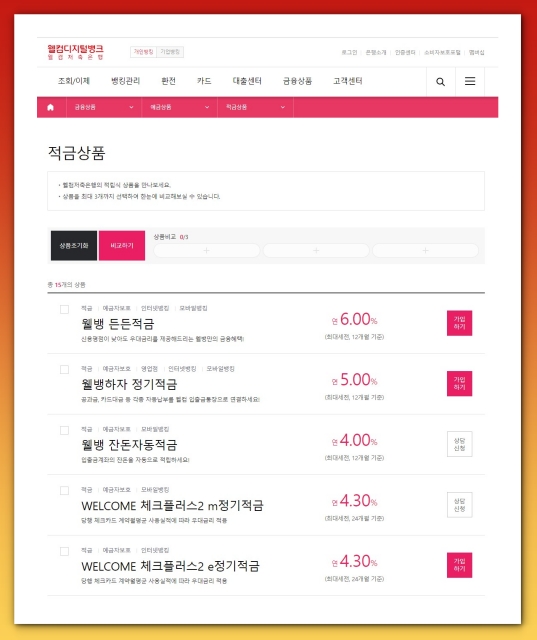 홈페이지에서 적금 상품을 검색하면 연 6%의 적금 이자부터 5%, 4%.... 쭉 상품이 나옵니다. 기준금리가 0%대이고,