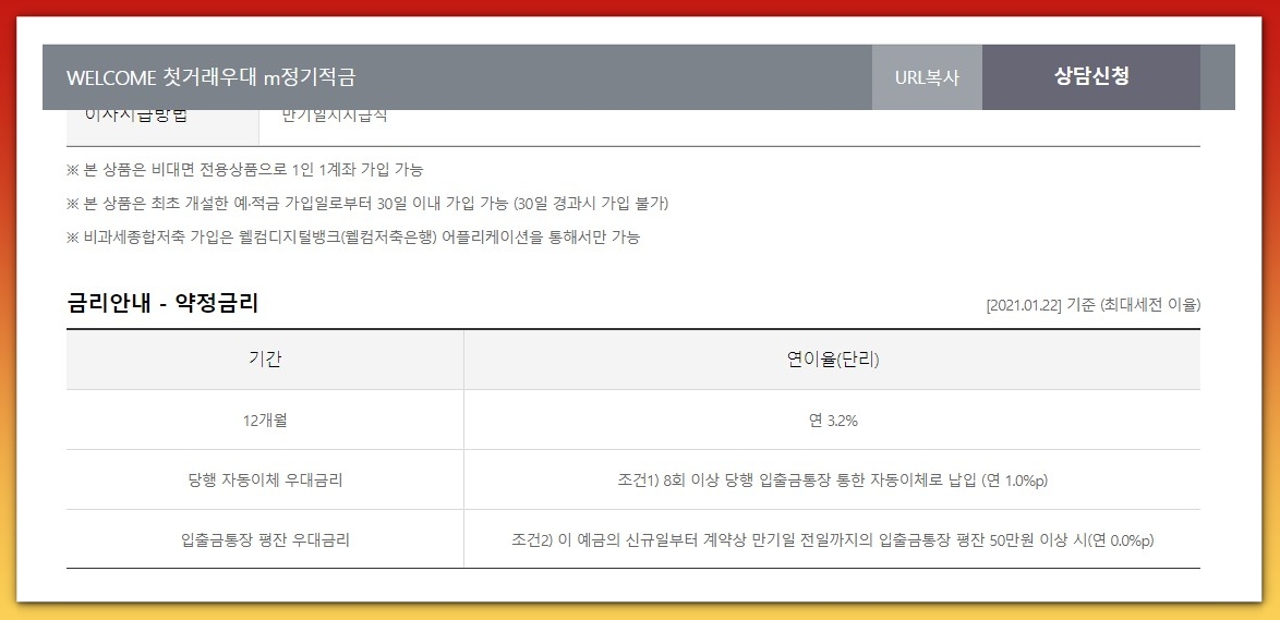 관리비 등 생활요금 자동이체 걸어놓고 파킹통장에 생활비 넣고 사용하면 우대금리 받는 것도 어렵지 않을 것 같은 느낌이라 그렇게 까다로운 조건은 아닌 것 같아요.