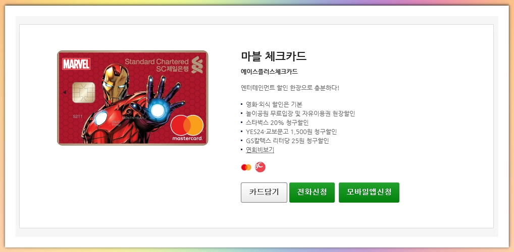 노리체크카드와 동일하게 스타벅스 20% 할인받을 수 있는 마블 체크카드입니다.