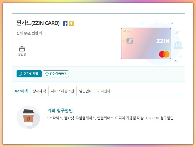 스타벅스뿐만 아니라 폴 바셋, 백 다방, 투썸까지 50% 할인이 되는 진정 커피매니아를 위한 카드예요.