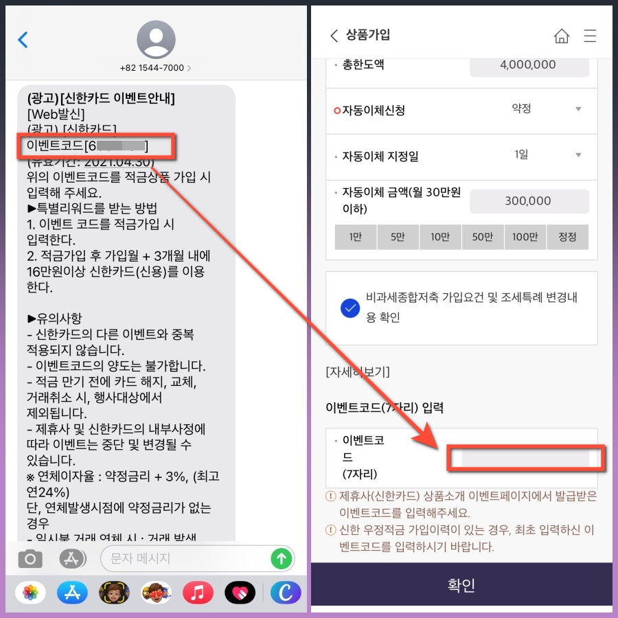 이벤트신청을 하면 신한카드에서 이벤트코드를 문자메세지로 보내줍니다. 이 이벤트코드를 적금 가입할 때 기입하면 특별리워드를 받을 수 있습니다.