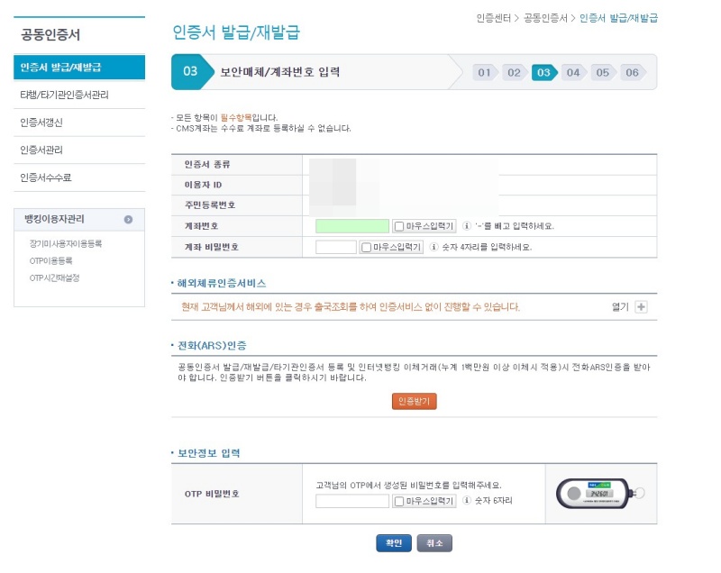 인증서를 발급 받은 계좌번호와 계좌 비밀번호를 입력하고 전화인증을 합니다. 전화인증에 필요한 전화번호는 은행에서 서류 발급에 작성한 전화번호 입니다. 이렇게 전화인증을 받은 후 은행에서 발급받은 보안카드를 가지고 보안정보를 입력합니다.
