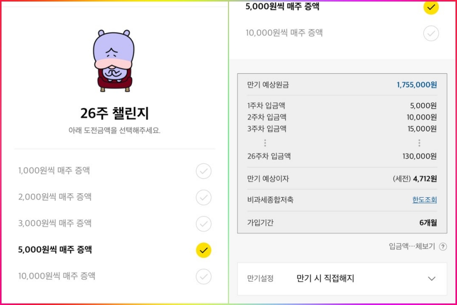 매주 만원씩 증액이 되고 마지막 26주에는 26만원이라는 돈을 넣어야 하죠.