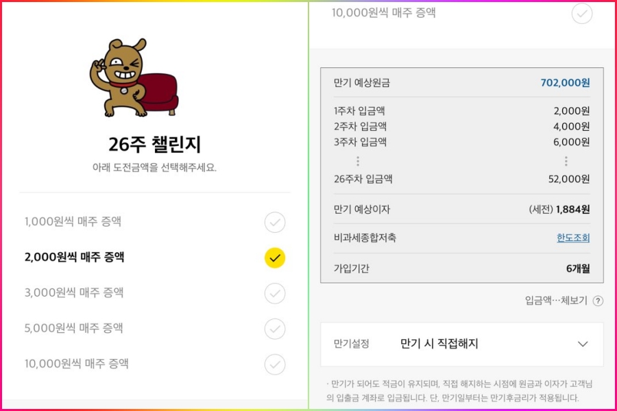 역시나 26주 동안 매주 2,000원씩 늘어가는 적금이에요.